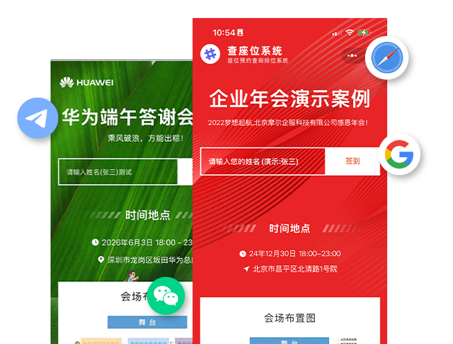 针对年会、论坛、峰会等场景打造,30个模版可选择,支持全页面自定义;客户扫码展示会议主题,输入姓名/电话即可获取座位号/桌号/房号等。