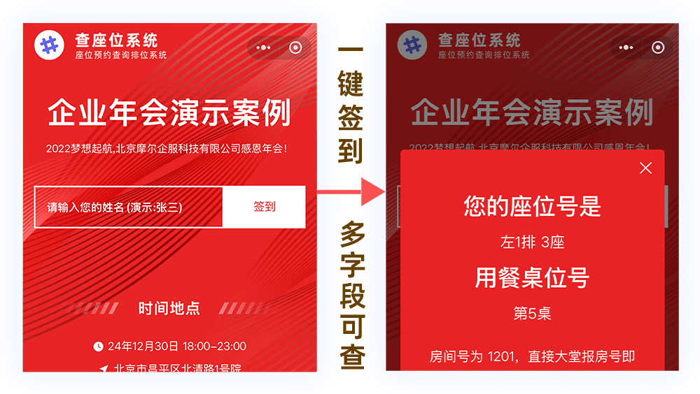 針對婚禮、晚宴等場景打造,頁面配置簡單明瞭;客戶掃碼即可查看宴會主題以及時間地點,輸入姓名/電話即可獲取桌號房號等資訊。
